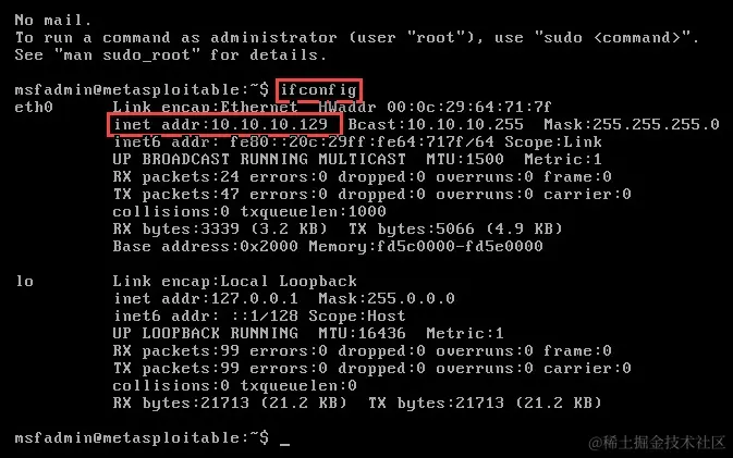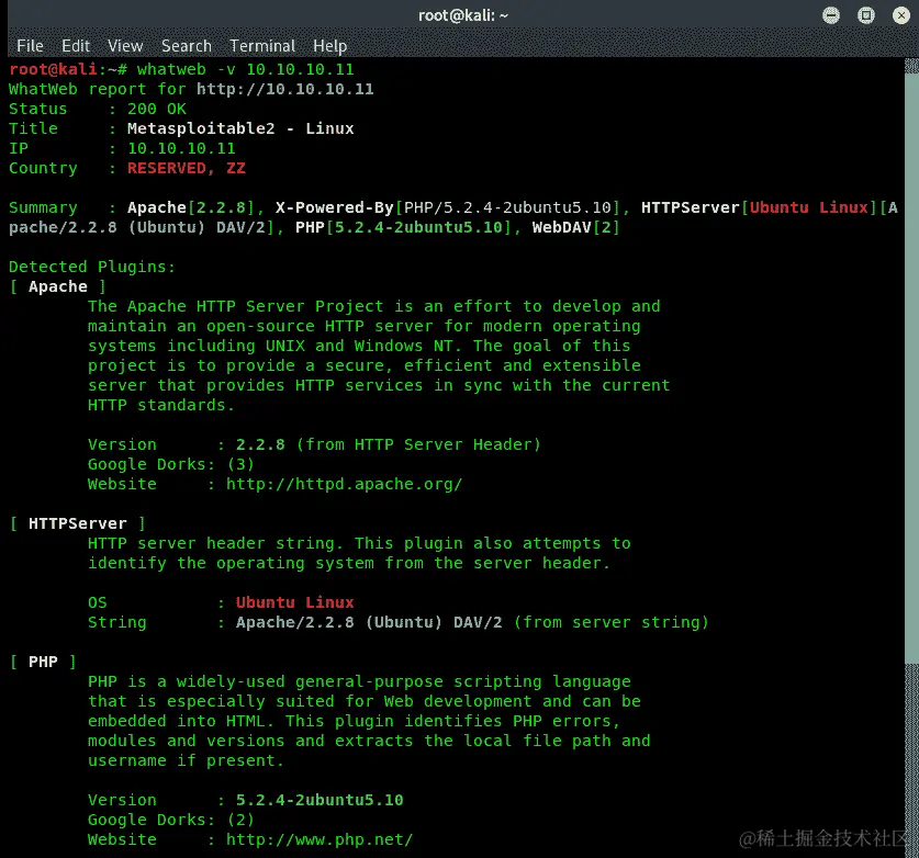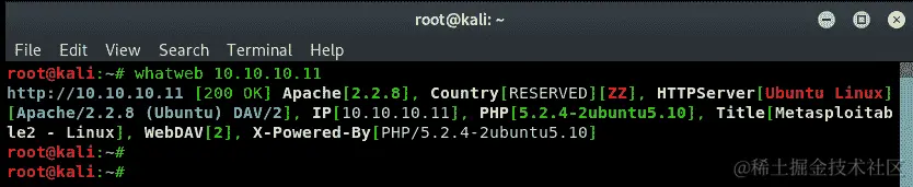 WhatWeb 能够为我们提供在我们的 Metasploitable 虚拟机上的 Web 服务器平台上使用的技术。