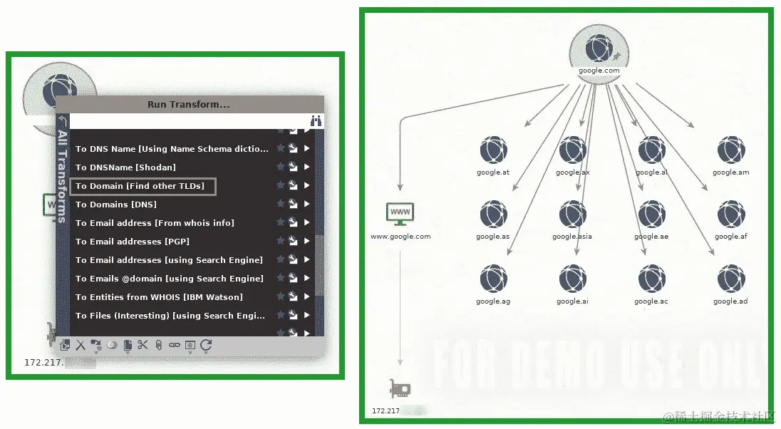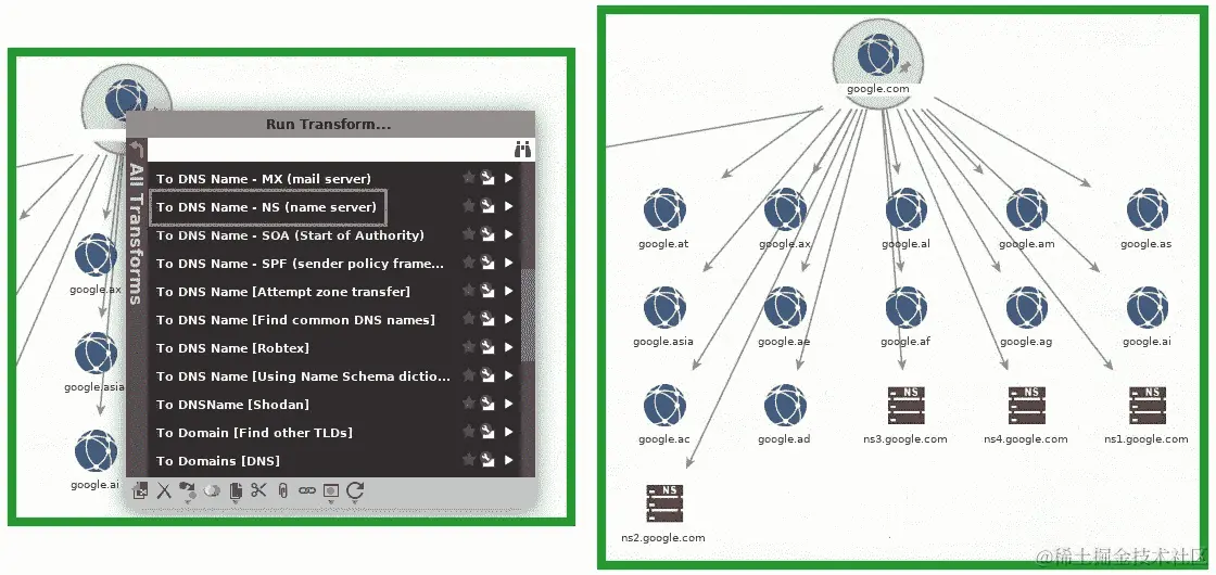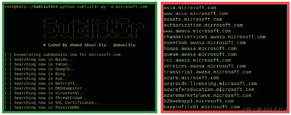 python sublist3r.py –d domain-name命令。左侧的屏幕截图显示了工具的成功调用,而右侧的屏幕截图显示了结果在终端上的显示: