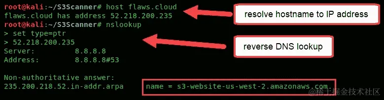 host命令来解析域的 IP 地址。然后,通过使用带有ptr参数的nslookup实用程序,可以执行反向查找,这将导致我们获取 AWS S3 存储桶的实际名称,如下面的屏幕截图所示: