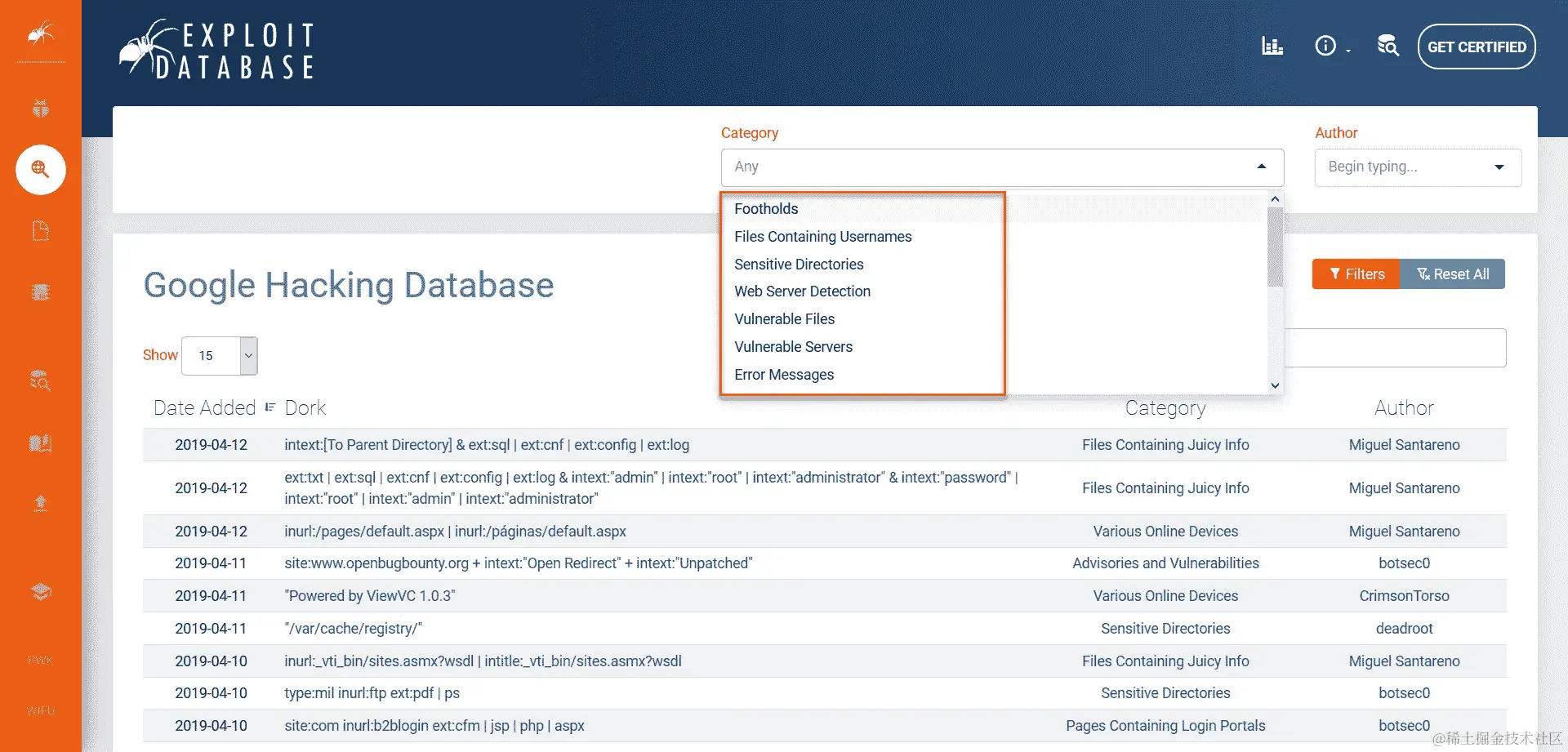 此外,Offensive Security 团队(www.offensive-security.com)维护着 Exploit Database(www.exploit-db.com),其中有一个专门的部分称为Google Hacking Database(GHD)(www.exploit-db.com/google-hacking-database)。GHD 由社区成员不断更新,包含许多类别的搜索参数,如下面的屏幕截图所示: