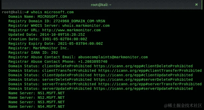 whois <domain-name>语法,如下图所示: