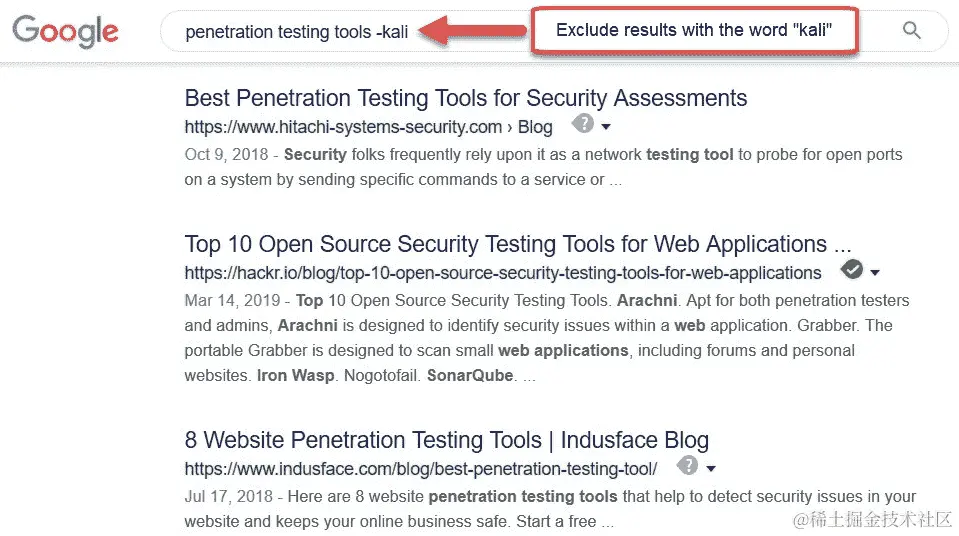 在我们的例子中,我们正在搜索渗透测试工具。同时,我们告诉谷歌搜索算法不显示包含单词kali的任何结果。此外,我们可以使用<string of text here> "keyword"语法来查看包含关键字的结果。