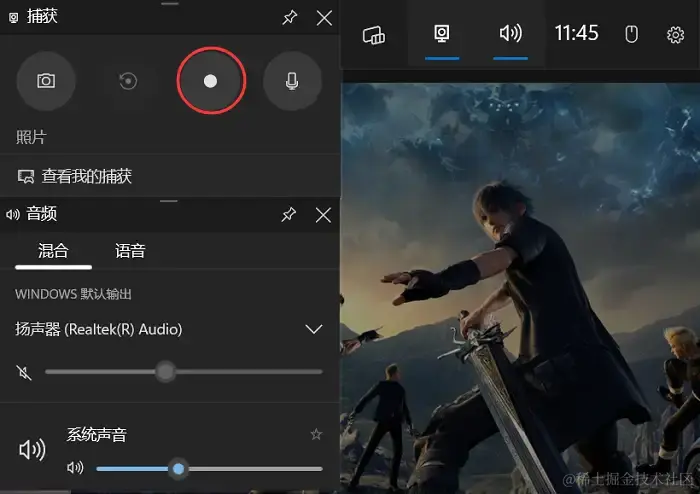 第2步:在Xbox Game Bar的主界面中,找到 “捕获” 选项卡,您可以在这里设置录屏的音频来源,然后点击“录制”按钮,即可开始录屏。