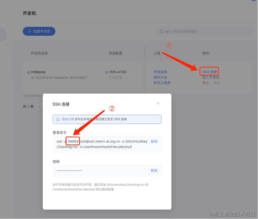 ssh 端口号就是下面图片里的 39864,请替换为你自己的。