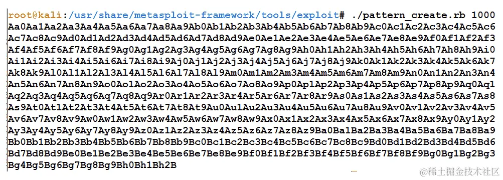 我们可以看到,在/tools/exploit/目录中运行pattern_create.rb脚本生成了 1000 字节的模式。这个输出可以提供给有漏洞的应用程序,如下所示:
