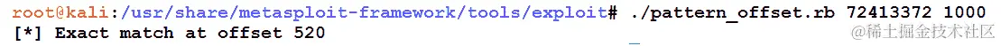 确切匹配在 520 处找到。因此,在 520 个字符后的任何 4 个字节都成为 EIP 寄存器的内容。