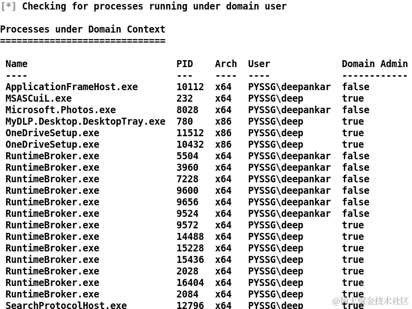 有趣。我们可以看到deepankar帐户是机器的本地管理员;然而,在域组和用户令牌帐户中有一个有趣的条目,即域管理员用户deep。这也可能意味着域管理员可能从这台机器上登录。该模块还将列出用户的运行进程,如下所示: