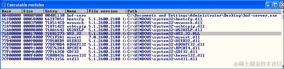 按下附加按钮后,让我们看看哪些 DLL 文件加载到有漏洞的应用程序中,方法是导航到“查看”并选择“可执行模块”选项。我们将看到以下 DLL 文件列表: