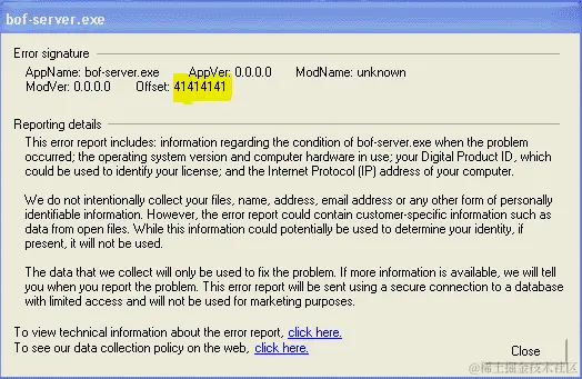 | 在上一节中,我们崩溃了应用程序。然而,为了利用该应用程序,我们需要知道足够填充空间和 EBP 寄存器的输入的确切大小,这样我们提供的任何内容都会直接进入 EIP 寄存器。我们将足够好以使我们正好在 EIP 寄存器之前的数据量称为偏移量。 | |