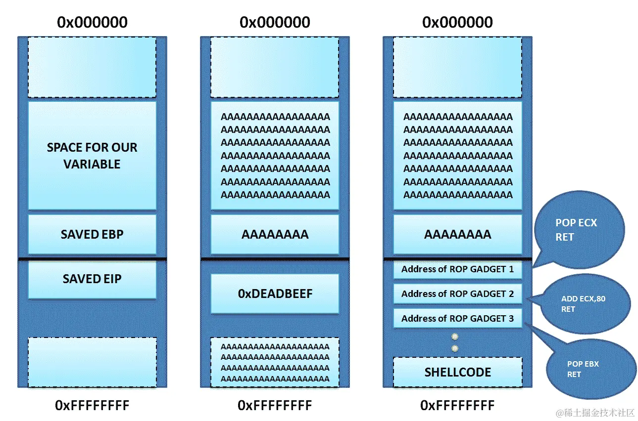 上述图表的左侧显示了应用程序的外观。然而,右侧表示了应用程序在满足缓冲区溢出条件时的行为。
