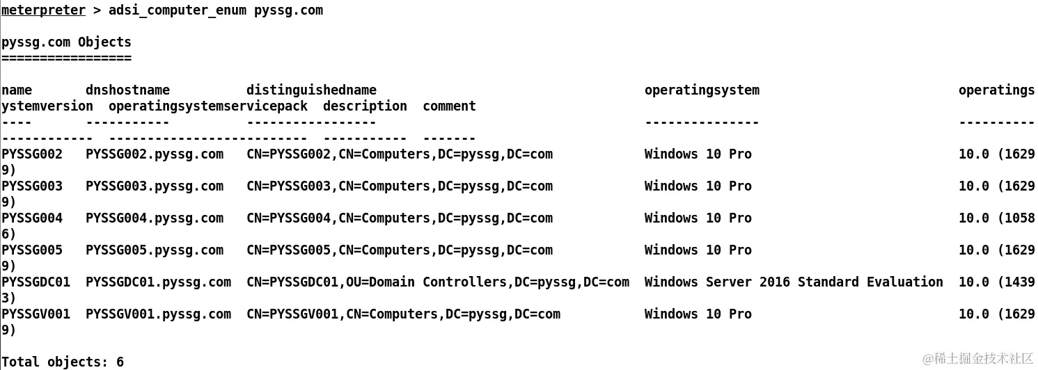 我们可以看到在pyssg.com域上发出adsi_computer_enum命令会枚举出网络上以前未知的许多其他系统。大多数系统都在运行 Windows 10 专业版操作系统。让我们看看我们还能得到什么: