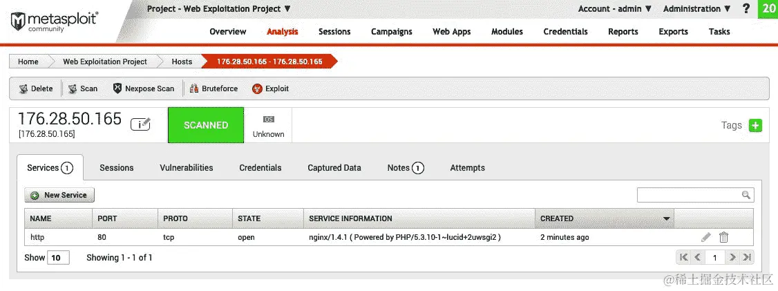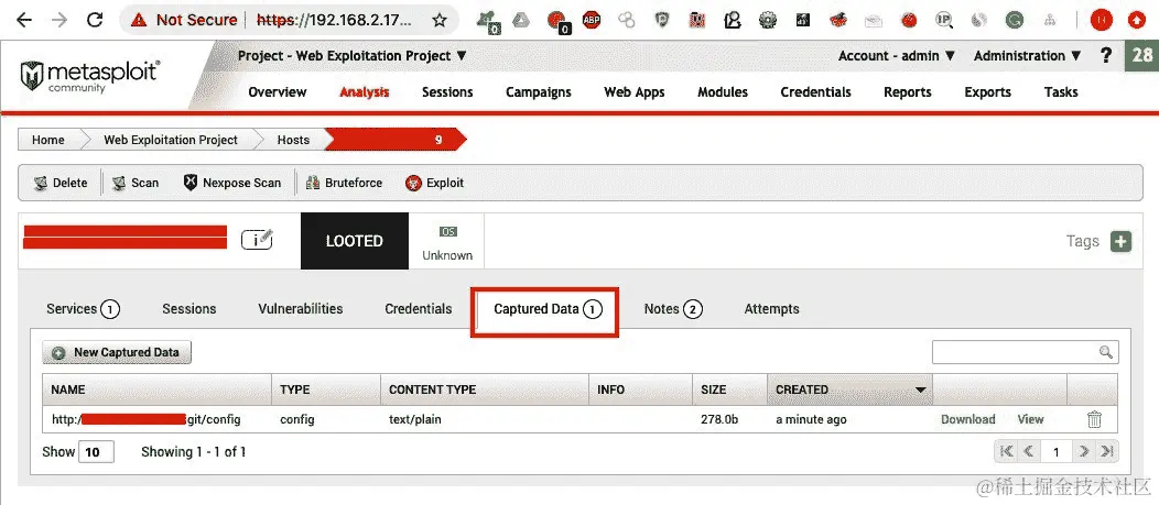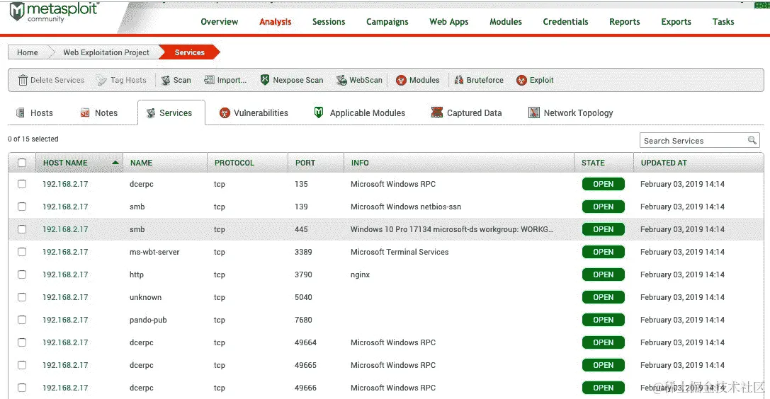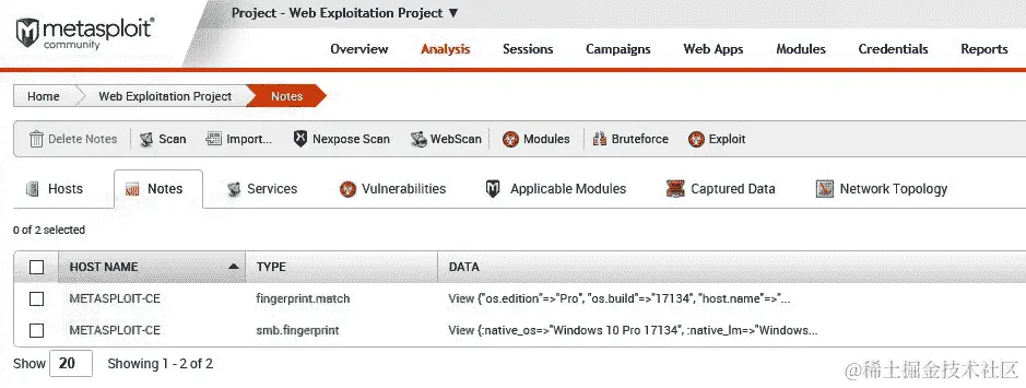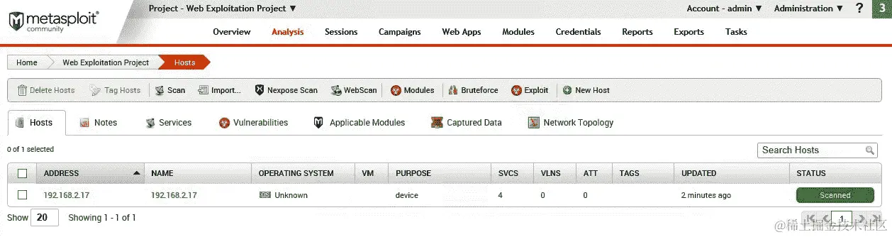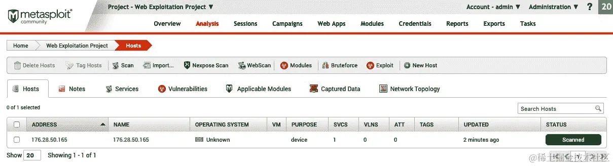 - 当模块完成执行时,我们可以返回到分析选项卡,点击我们运行模块的主机 IP: