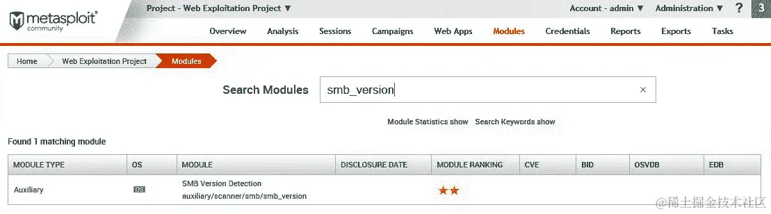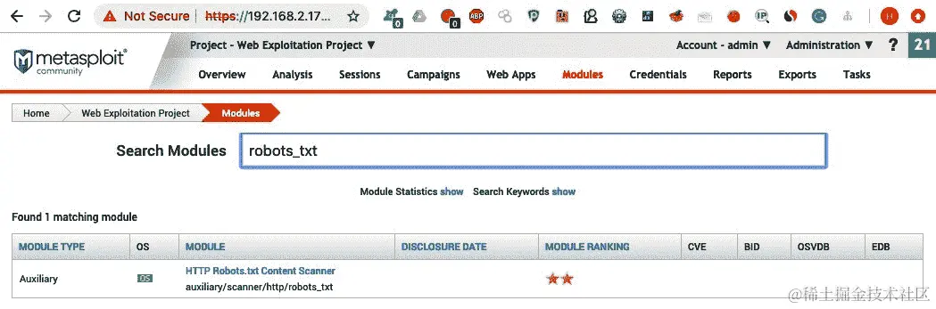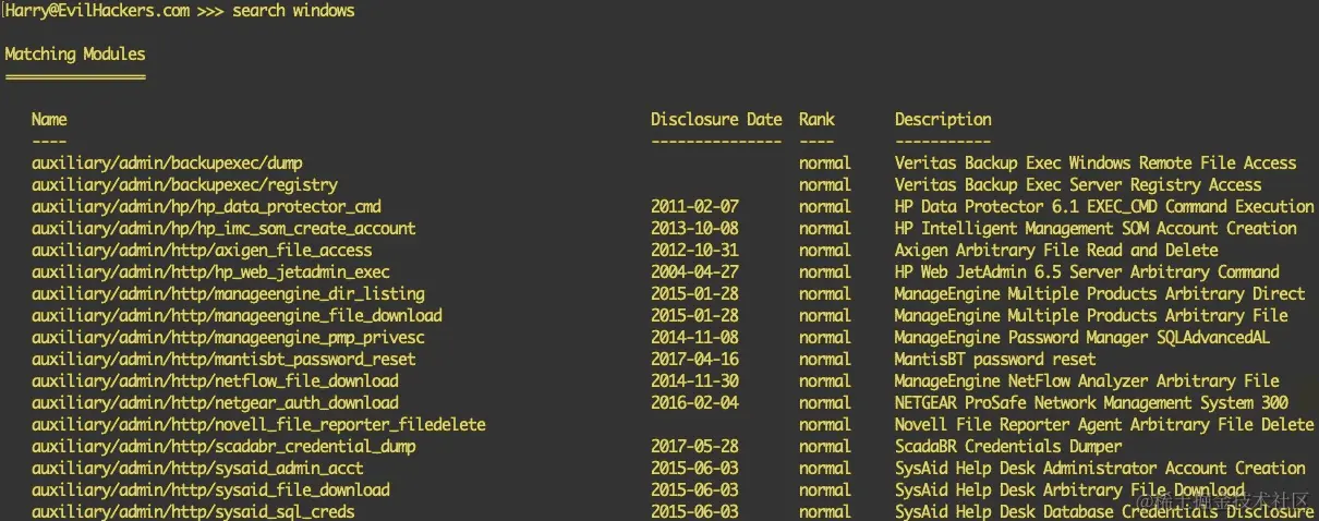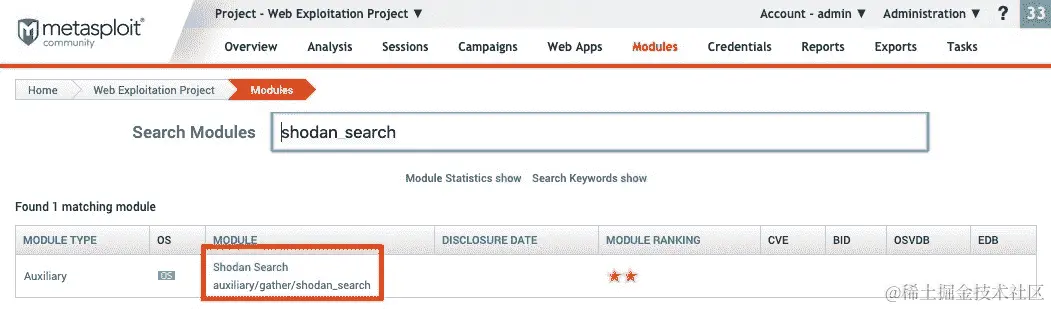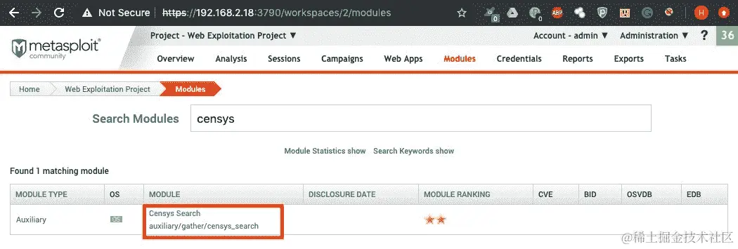 - Metasploit 还有一个内置的辅助程序,可以进行 Censys 扫描。我们可以在模块搜索中使用