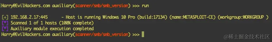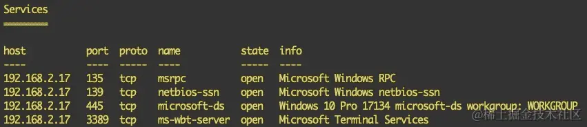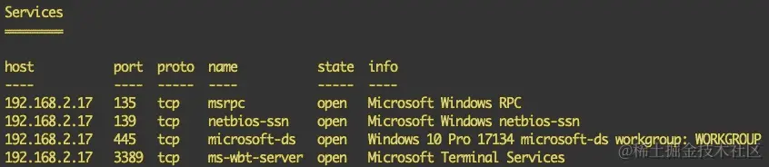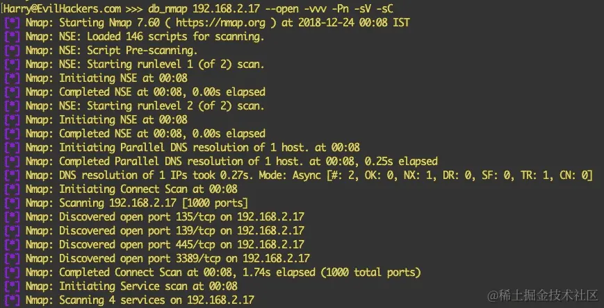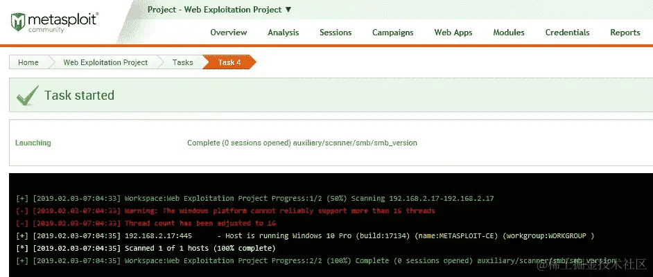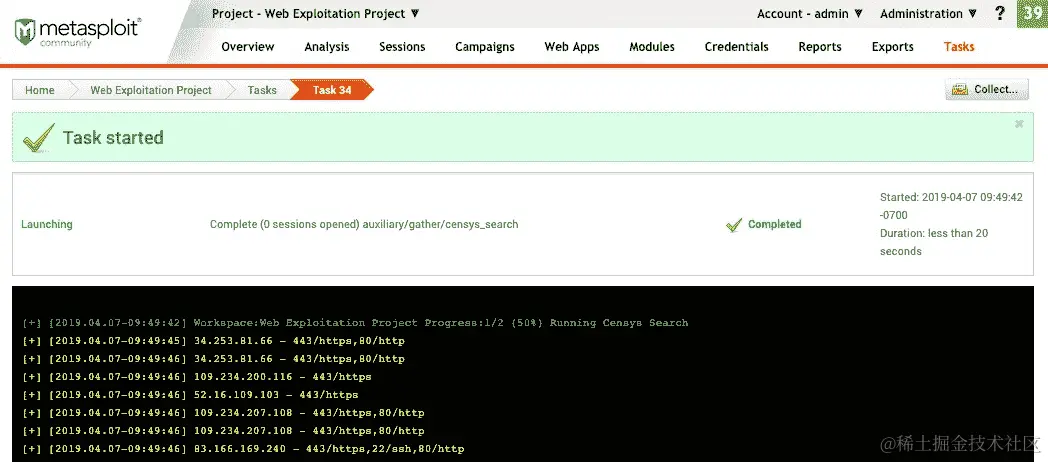 - 点击运行模块将创建一个新任务。辅助程序将搜索不同的主机和它们的端口。结果将如下截图所示打印出来: