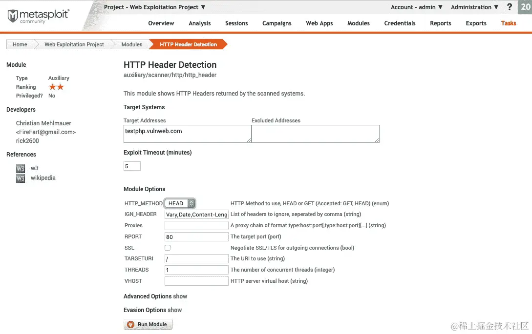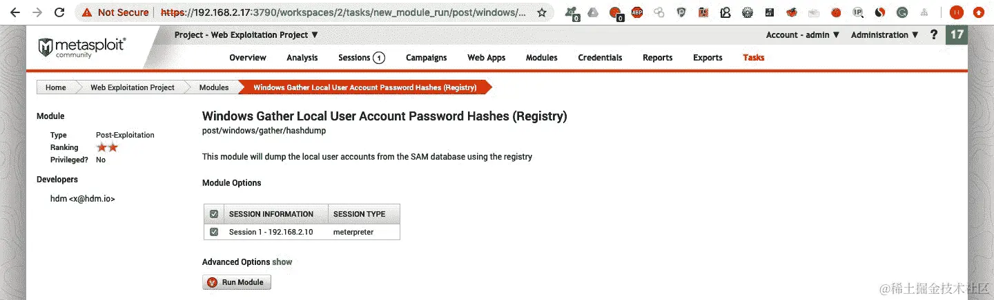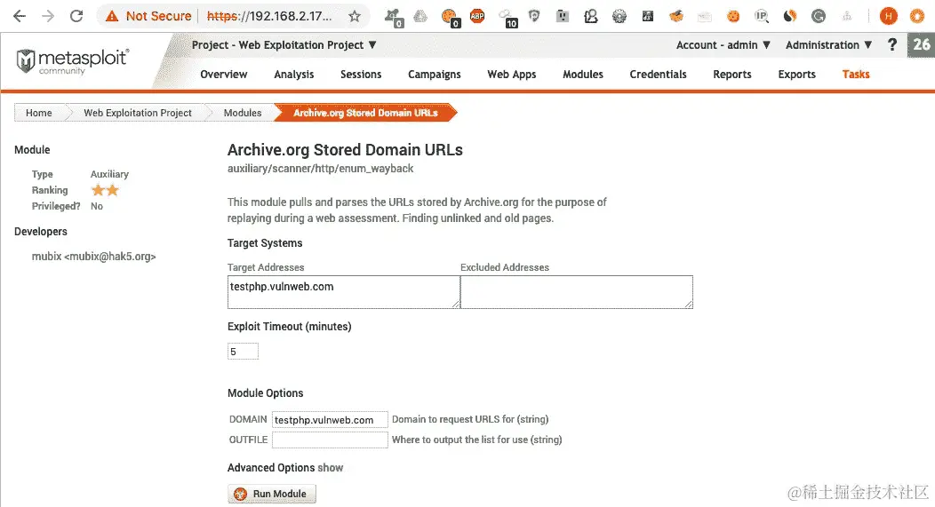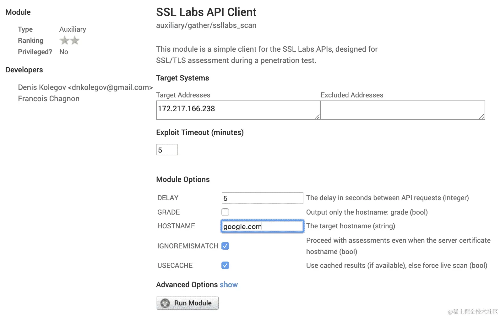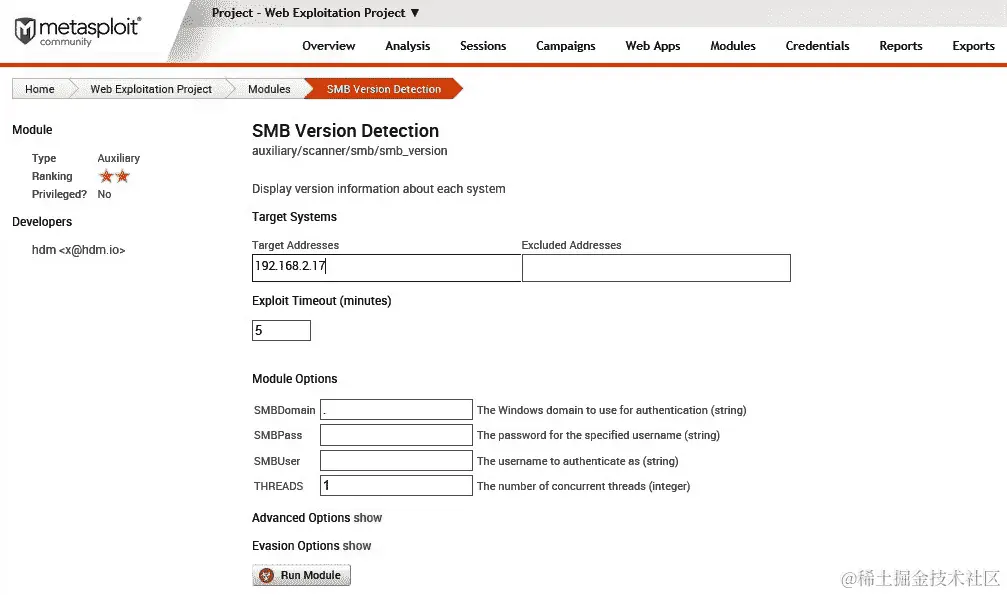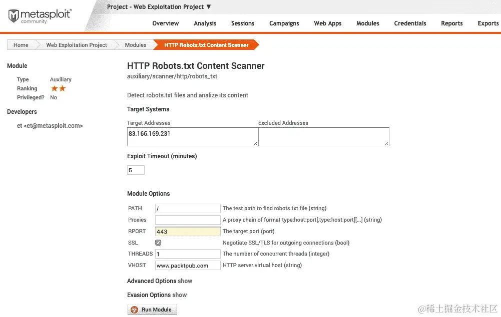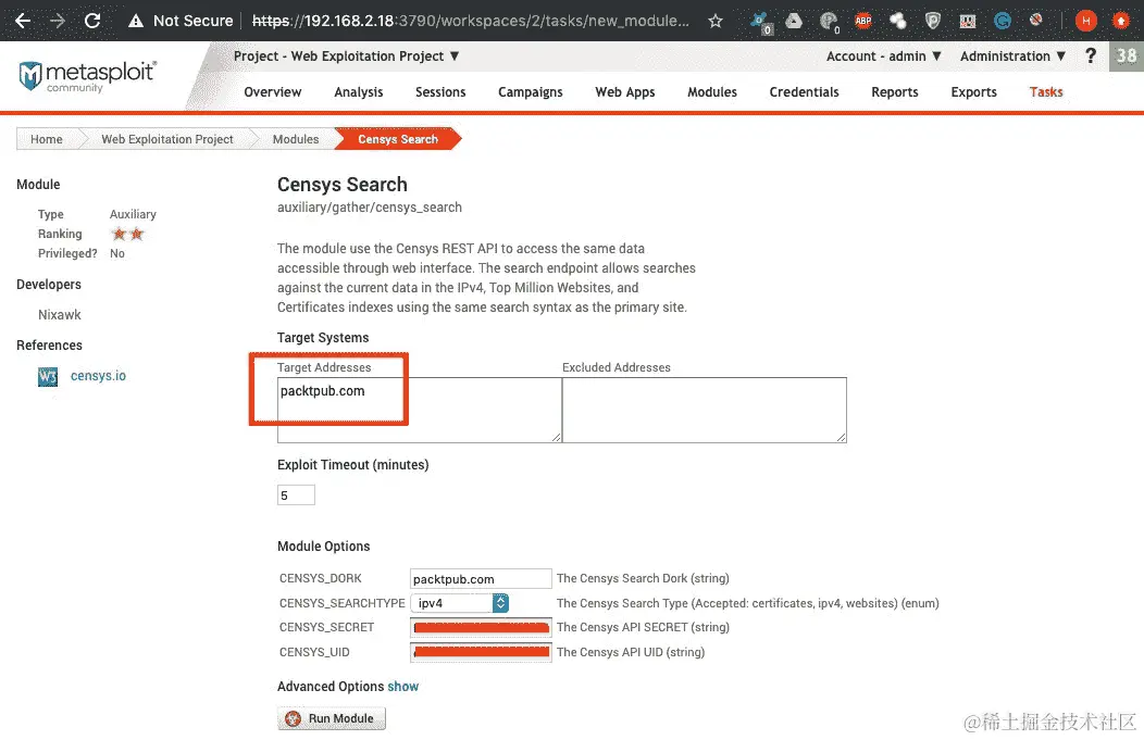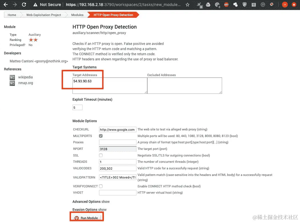 - 单击模块名称将重定向到选项页面。在这里,我们设置目标并单击运行模块:
