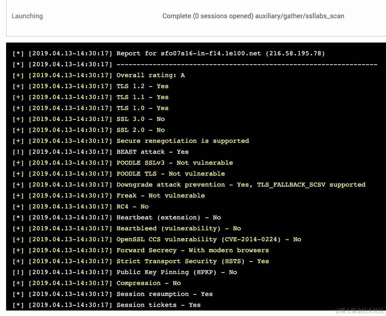 SSL 可以透露很多东西,比如证书颁发机构、组织名称、主机和内部 IP。我们可以使用相同的模块来了解服务器上运行的 SSL 版本,检查服务器允许的密码,以及检查目标站点是否启用了HTTP 严格传输安全(HSTS)。