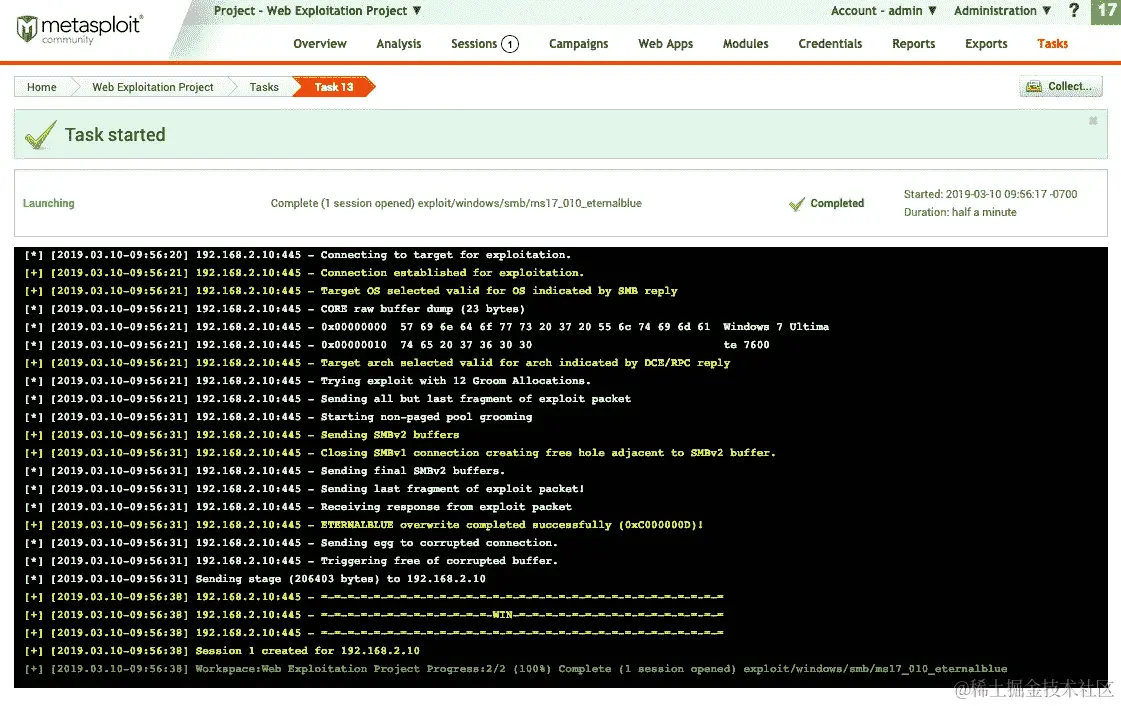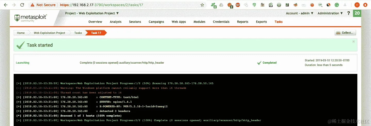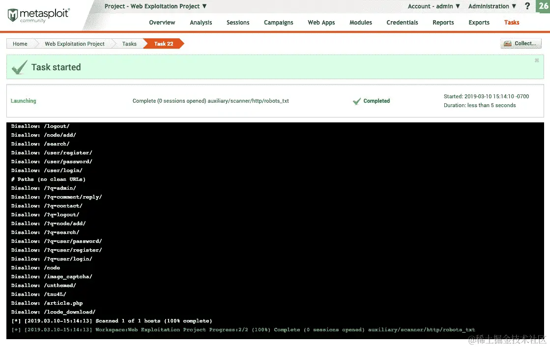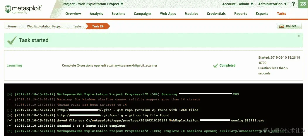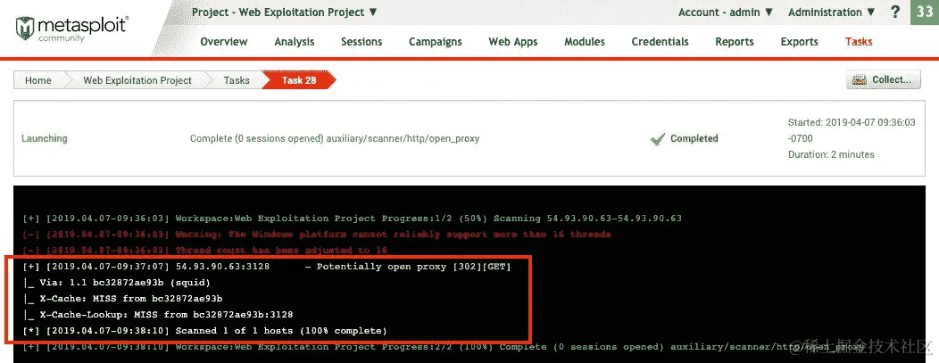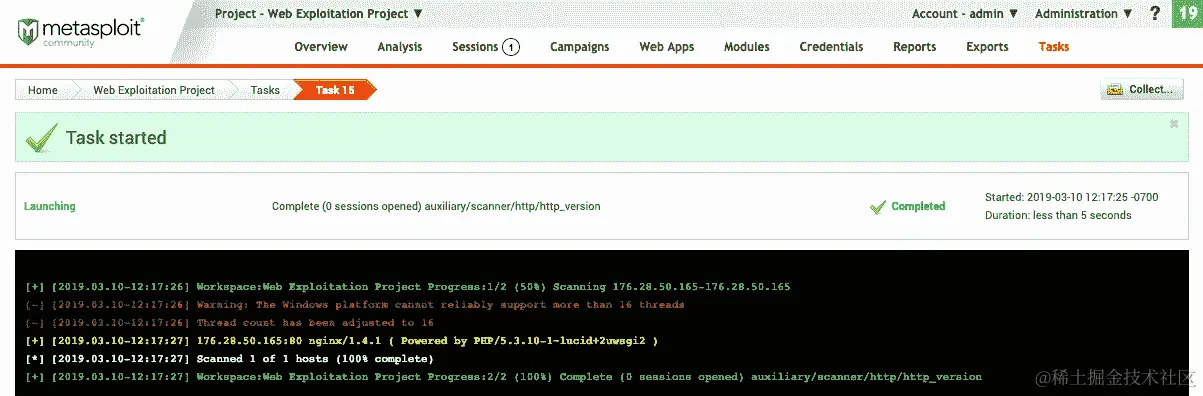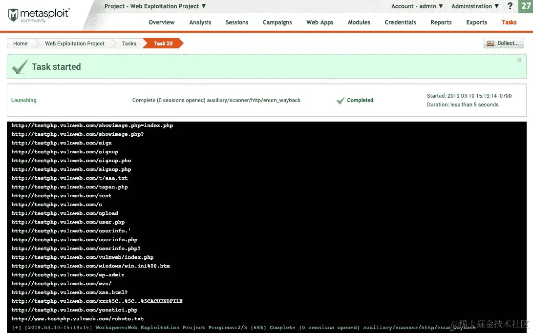 将创建一个新任务,该任务将显示我们的扫描结果和输出,如下面的屏幕截图所示: