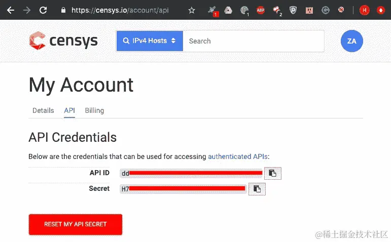 censys.io上的帐户,并获取 API ID 和 Secret,这将在模块中使用: