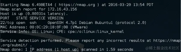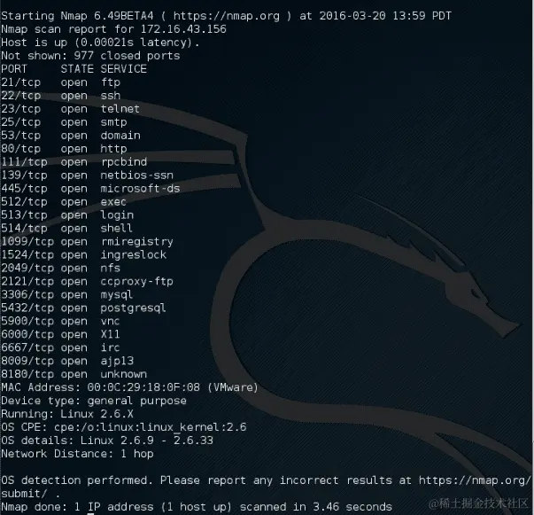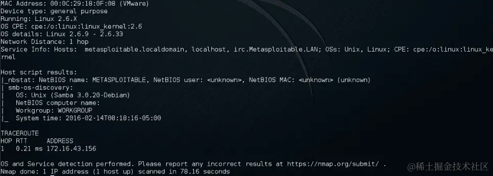 目标服务器位于172.16.43.156,而您的机器的 IP 地址为172.16.43.150。要检查目标服务器的可用性,您可以给出以下命令: