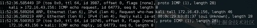 从前面的屏幕截图中,我们知道已向目的地(IP 地址=172.16.43.156)发送了一个 ICMP echo 请求数据包。同时,发送主机(IP 地址=172.16.43.150)收到了一个 ICMP echo 回复数据包。所需的往返时间为.869 ms,在整个过程中没有丢包。