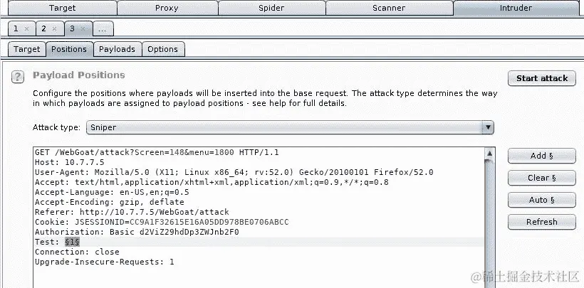 我们已经确定了一个似乎是可预测的会话 ID。现在让我们试着找到一个有效的会话。为此,您将使用接收到 cookie 的相同请求并将其发送到 Intruder。在这种情况下,您只需要重复相同的请求几次。但是,Intruder 需要有插入点才能运行,因此在请求中添加一个头部(Test: 1),并在其值中设置插入位置: