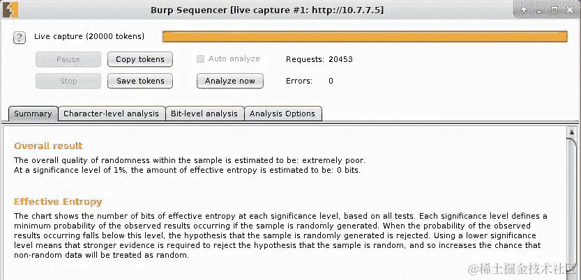 Burp Sequencer是一种统计分析工具,可以让你收集大量的值,如会话 ID,并对它们进行计算,以评估它们是否是随机生成的,或者只是混淆或编码。这在处理复杂的会话 cookie 时非常有用,因为它可以让你了解 cookie 是如何生成的,以及是否有攻击或预测的方法。