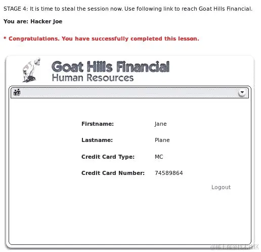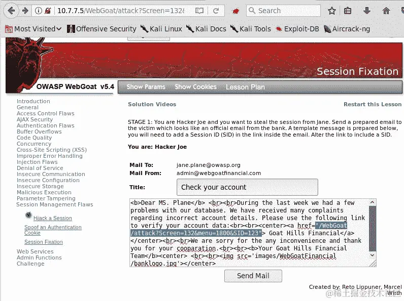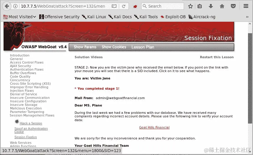 由于电子邮件看起来合法,因为它来自admin@webgoatfinancial.com,所以您点击链接,它会将您发送到登录页面,然后您相应地登录。现在有一个使用攻击者发送的参数的有效会话。