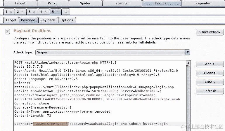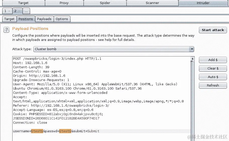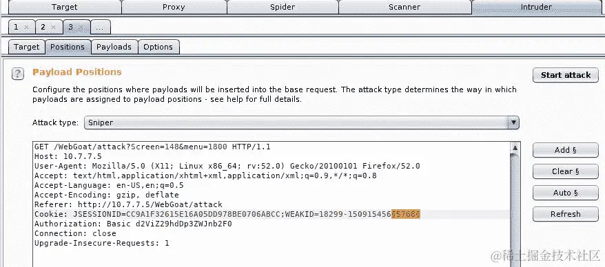 现在再次将相同的原始请求发送到 Intruder。这次,在其后添加一个 cookie。在JSESSIONID的值之后,添加以下内容(记得根据您的结果调整值):