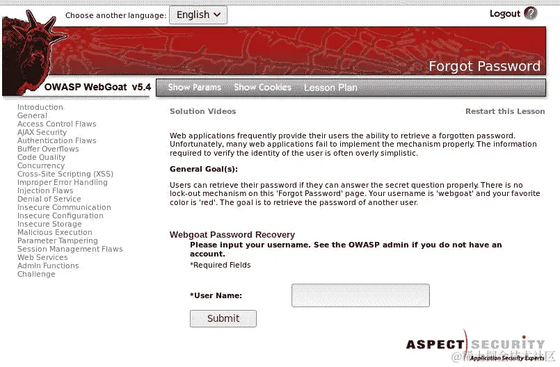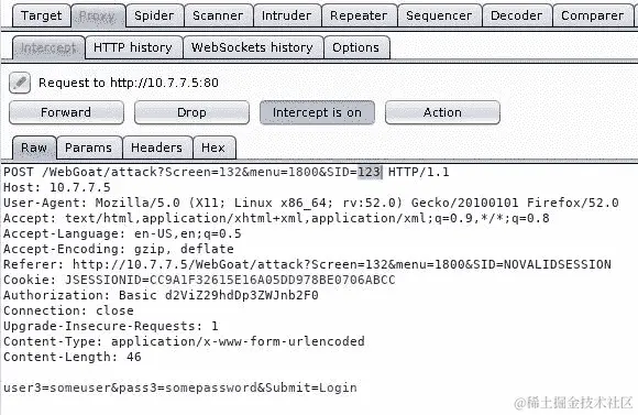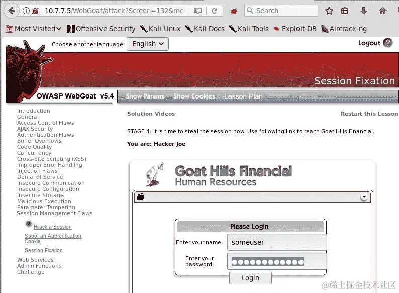WebGoat 有一个相对简单但非常具有说明性的演示,展示了这种漏洞(转到 WebGoat | 会话管理缺陷 | 会话固定)。我们将使用它来说明如何执行这种攻击。