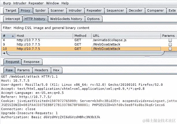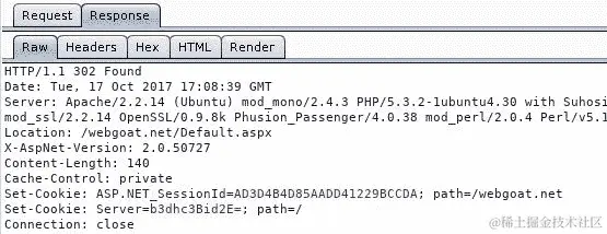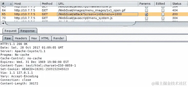 要使用 Burp Sequencer,首先需要找到设置会话 cookie 的响应。通常是成功登录的响应,带有Set-Cookie头。在下面的截图中,你可以看到设置 WebGoat 会话劫持练习的会话 cookie(WEAKID)的响应(转到 WebGoat | 会话管理缺陷 | 劫持会话):