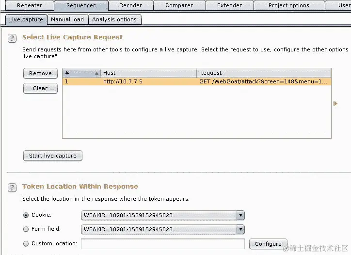 在 Burp Proxy 的历史记录中找到该响应,右键单击它。然后,您将看到“发送到 Sequencer”选项。进入 Sequencer 后,您需要选择它所关注的响应部分: