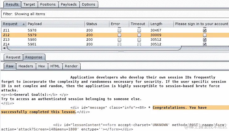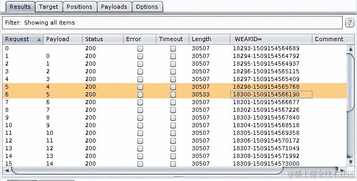 现在您可以在 Intruder 的结果表中看到WEAKID值,并且可以验证 cookie 值的第一部分是一个递增的顺序号,第二部分也总是递增的。这取决于请求被服务器接收的时间。如果您查看以下屏幕截图,您会发现序列中存在一些间隙: