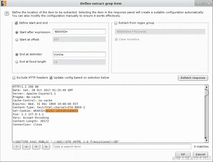 现在转到“选项”选项卡,在“Grep-Extract”部分添加一个项目。确保选中“根据下面的选择更新配置”复选框,并仅选择 cookie 的值: