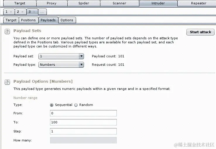 在此测试中,您将发送 101 个请求,因此将有效负载设置为“数字”类型,从 0 递增到 100: