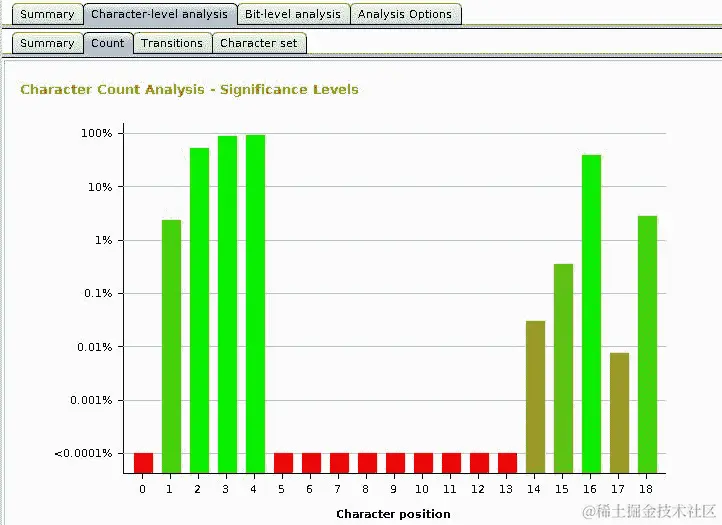 在下面的屏幕截图中,您将看到字符分析图表。您可以看到在位置 3、4、15、16 和 18 的字符变化要比位置 0 或 5 到 13 的字符更多,后者似乎根本不变。此外,字符 0 到 4 表明是一个计数器或递增的数字,因为最后一个字符的变化比前一个字符更多,而该字符比前一个字符更多,依此类推。我们将在下一节中验证这一点: