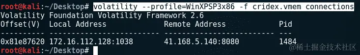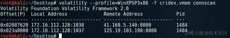 connections命令在那个时候只显示了一个活动连接。要显示已终止的连接列表,使用connscan命令。connscan命令也仅适用于 Windows XP 和 2003 服务器(32 位和 64 位)系统: