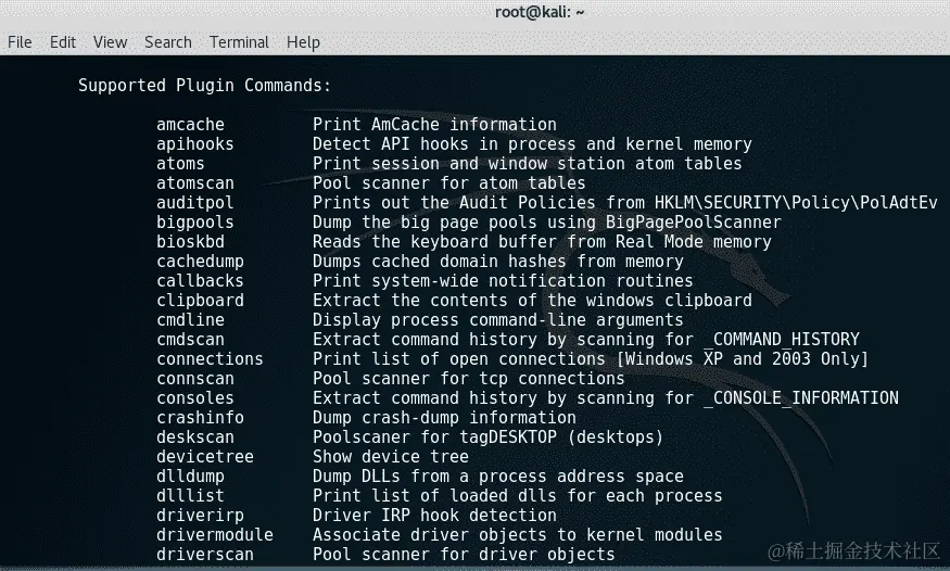 要获得所有插件的完整列表,打开一个单独的终端并运行volatility -h命令,而不是不得不滚动到您用于运行 Volatility 插件命令的终端的顶部: