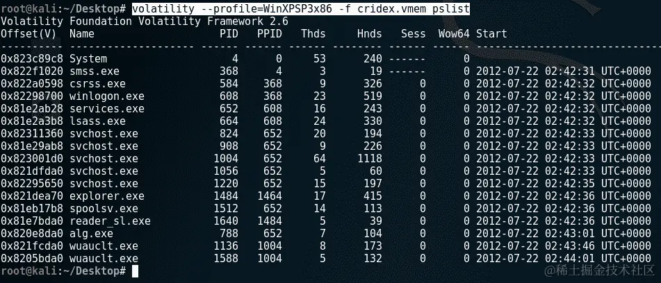 查看运行进程列表后,我们通过输入以下命令运行psscan命令: