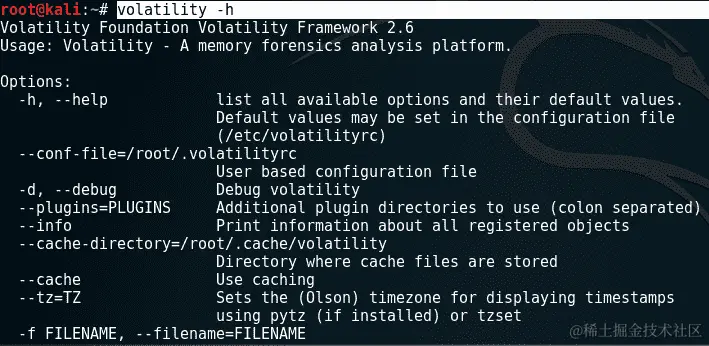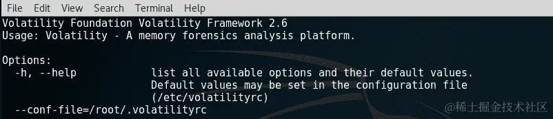 单击 Volatility 图标会在终端中启动程序。当 Volatility 启动时,我们看到正在使用的版本是2.6,并为我们提供了使用选项: