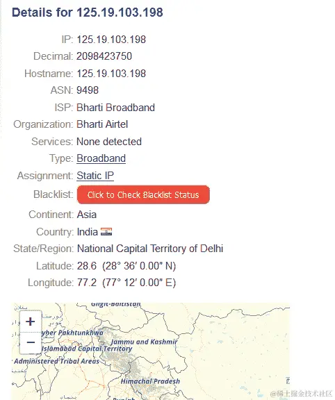 通过点击“获取 IP 详细信息”按钮,我们得到以下结果,包括 ISP 名称、洲和国家详情,以及显示设备大致位置的地图: