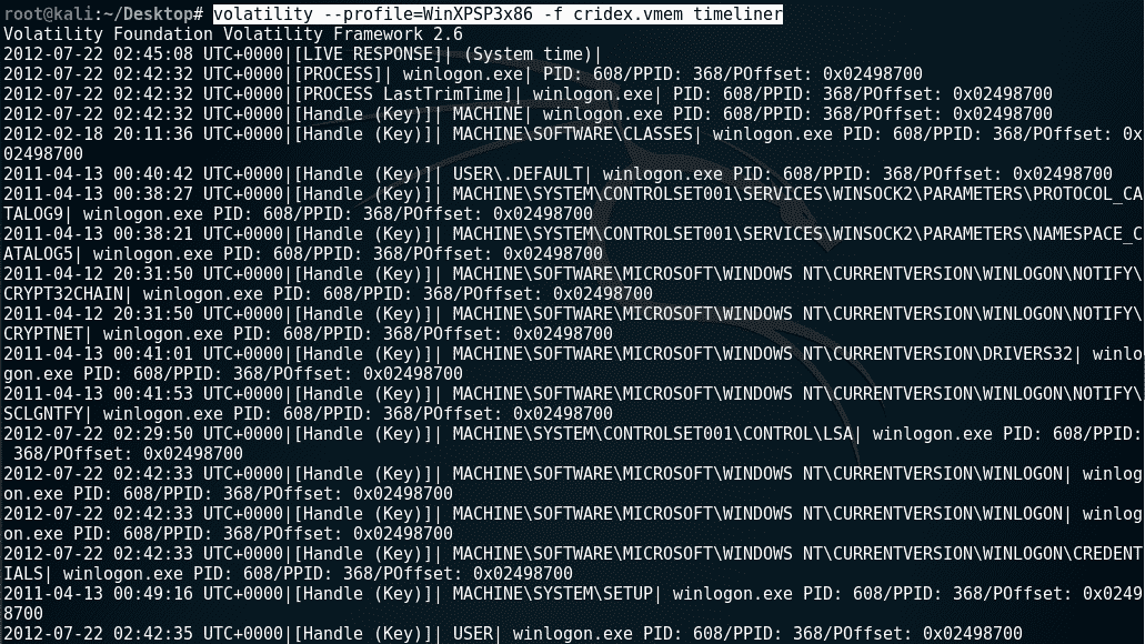 volatility --profile=WinXPSP3x86 -f cridex.vmem getsids