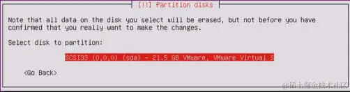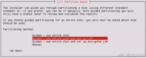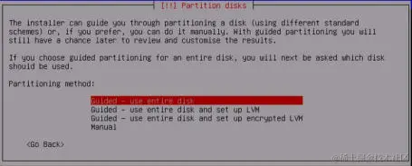 如果没有理由选择不同的项目,建议你保留默认。 你不需要在安全环境中执行任何手动分区操作,因为每个虚拟机通常都使用单个专用分区。 选择分区方法后,会要求你选择磁盘。 除非你已将其他磁盘添加到虚拟机,否则你只应在此处看到以下选项: